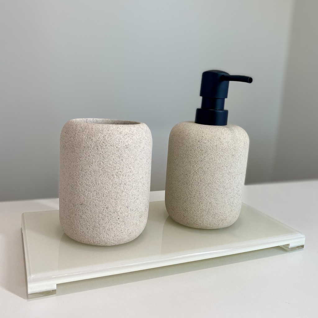 Cor: Fendi e transparente - Foto ilustrativa. Os pés da bandeja são transparentes. As cores e acabamentos do produto podem sofrer variação de acordo com a configuração da sua tela. O kit de porta-sabonete e copo não acompanham o produto.